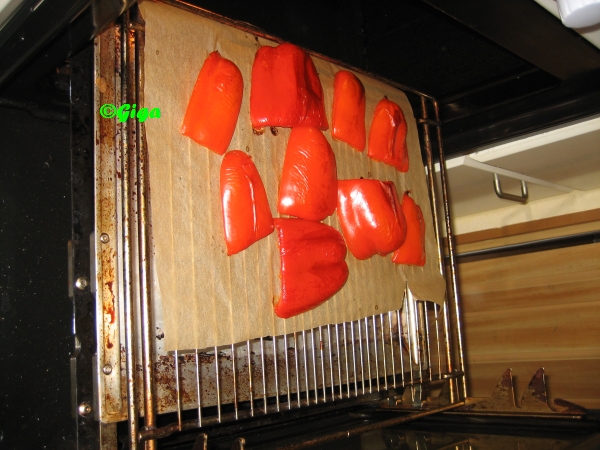 Paprika waschen, halbieren und bei 180 Grad fuer ca. 30 Minuten in den Ofen geben (bis die Haut Blasen wirft).
