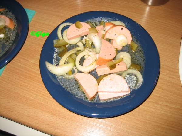 Die Stadtwurst in Scheiben schneiden, die Gewuerzgurken in Wuerfel schneiden. Die Zwiebeln in Ringe schneiden.